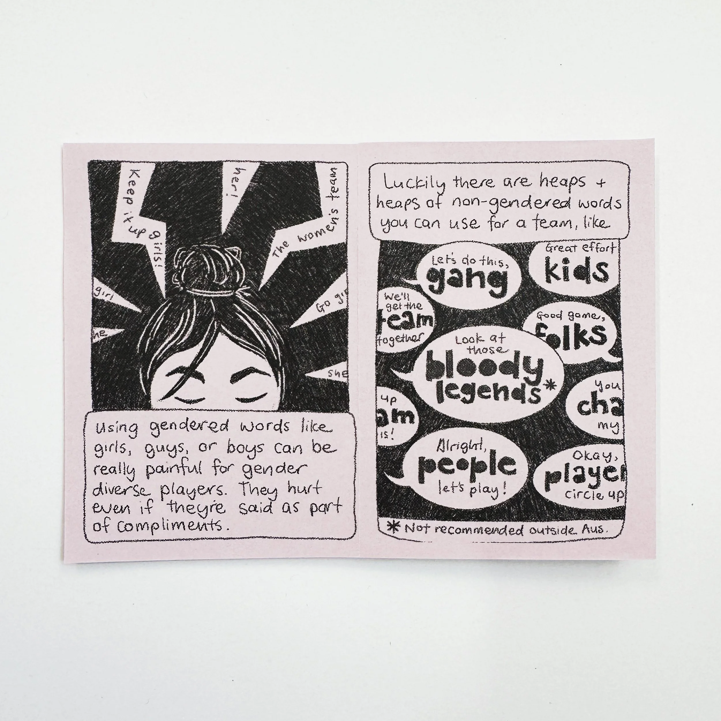 Sporting spaces are some of the hardest for genderqueer folks to inhabit, but we can make them a safer by being inclusive in the language that we use. This zine has some suggestions for small changes that can make a big difference.